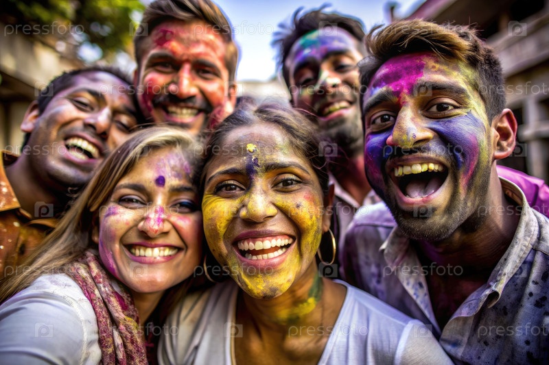 Близкий взгляд на радостных индийских людей, празднующих фестиваль Холи яркими цветами
