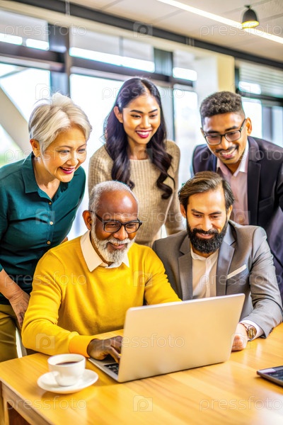 Разнообразная команда сотрудничает в ярком офисе, просматривая проект на ноутбуке