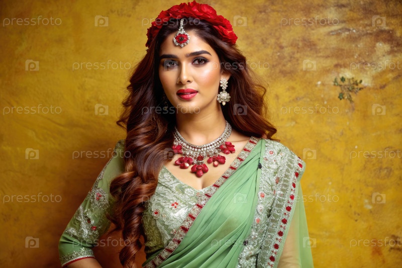 Женщина в светло-зеленом сари позирует на теплом текстурированном фоне
