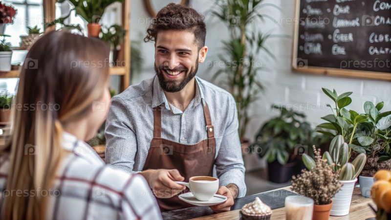 Дружелюбный бариста, подающий кофе клиенту в уютной обстановке кафе