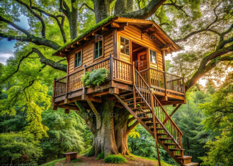 Уютный домик на дереве, расположенный среди пышной зелени в безмятежной лесной среде