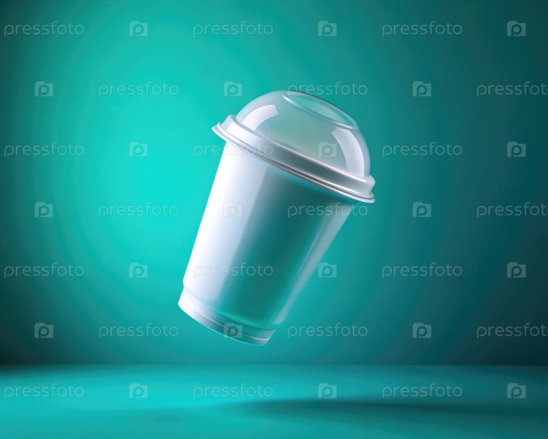Белая пластиковая чашка сока, левитующая на гладком бирюзовом фоне