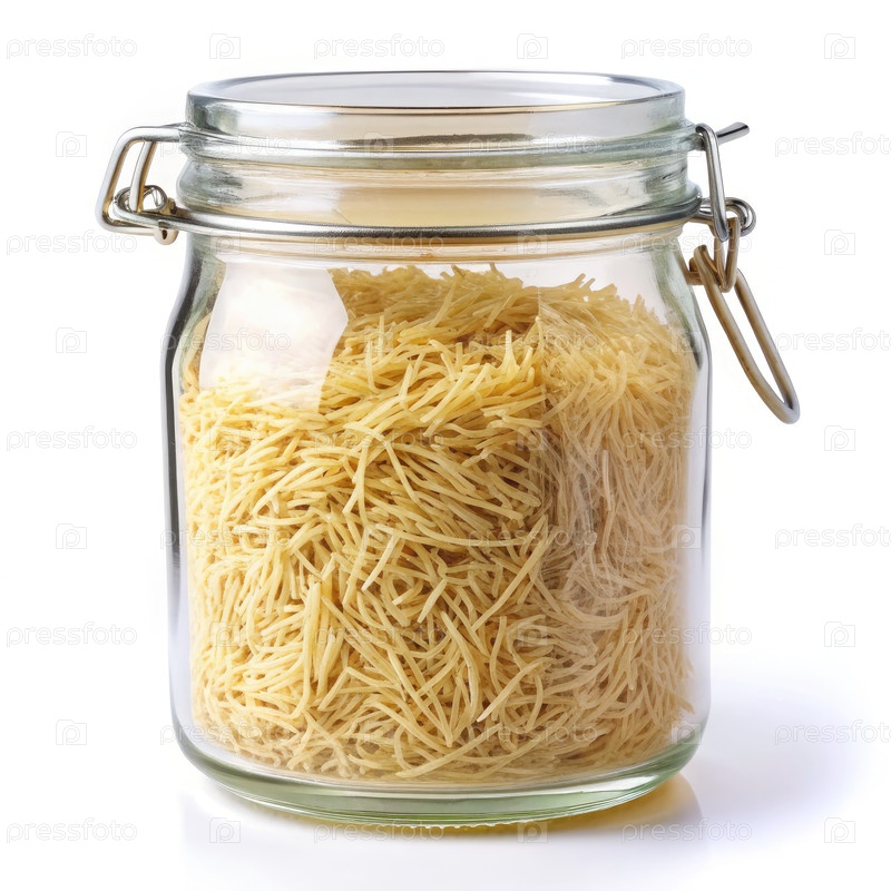 Зерна лапши хранятся в прозрачной стеклянной банке на столешнице кухни