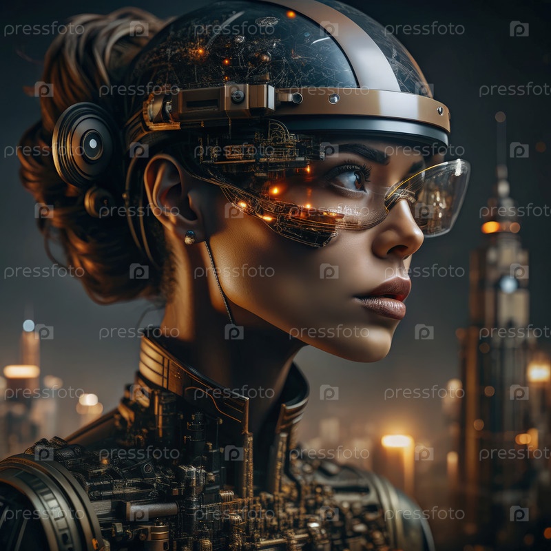 Футуристическая женщина смотрит на неоновый городской пейзаж при закате с помощью передовых технологий