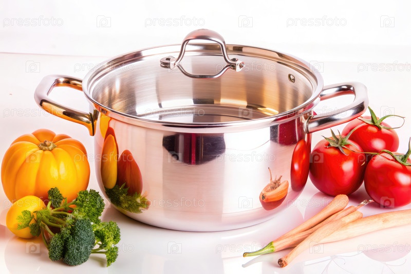 Горшок из нержавеющей стали с овощами, выделенными на белом фоне. генеративный ИИ