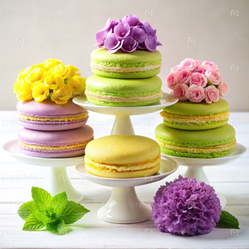 Три слоя тортов с желтым, зеленым и фиолетовым цветами изображены элегантно на стендах