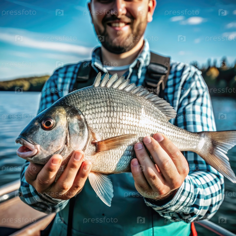 Удовлетворенный рыбак, держащий на озере в солнечную погоду гребень