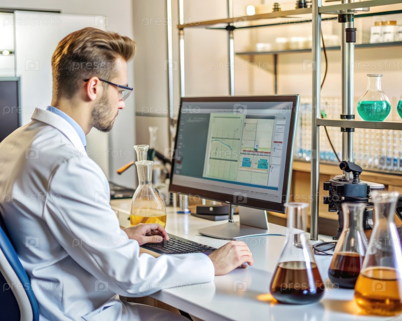 Ученый анализирует данные на лабораторном компьютере во время исследовательской деятельности