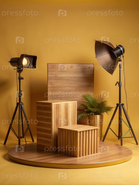 Настройка продуктовой фотографии с деревянной подиумом и студийным освещением на желтом фоне