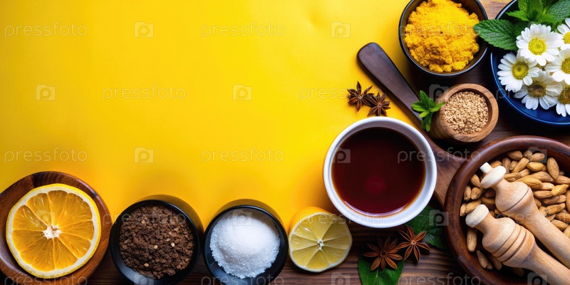 Живое расположение специй и ингредиентов на ярко-желтом фоне