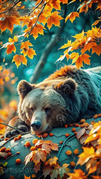 Медведь спокойно спит среди осенних листьев в ярком лесу