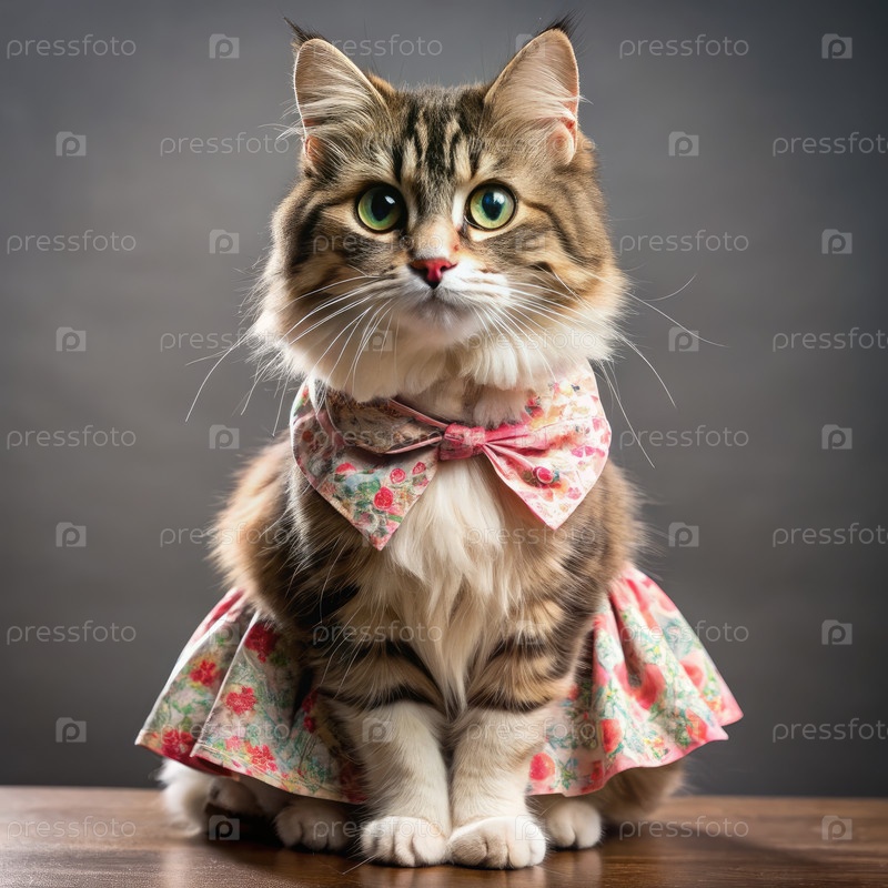 Пушистая кошка носит цветочное платье, сидя на деревянной поверхности в помещении
