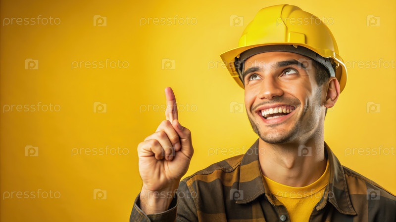 Молодой строительный работник улыбается и указывает на ярко-желтую обстановку
