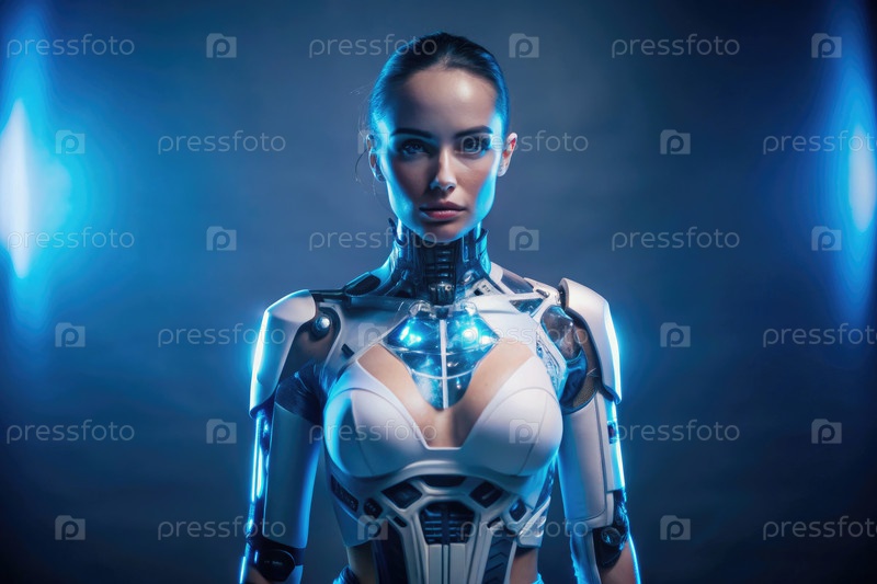 Женщина-киборг в ярком белом дизайне, которая смотрит прямо на камеру