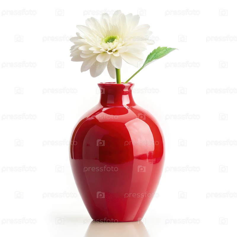 Элегантная красная ваза с белым цветом на чистом белом фоне