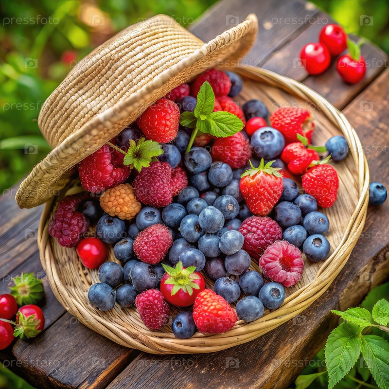 Свежесобранные ягоды собраны в соломенной шляпе в солнечный садовый день
