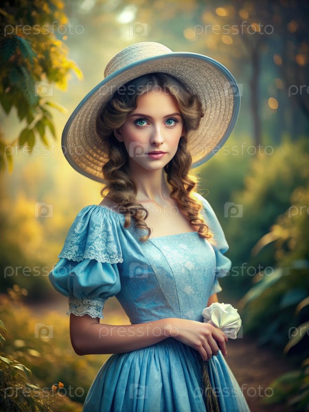 Молодая дама в голубом платье и шляпе с широкими лапами держит розу в солнечном лесу