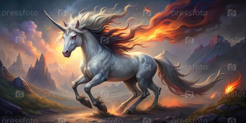 Мистический демонический единорог, бегущий по огненному ландшафту на закате