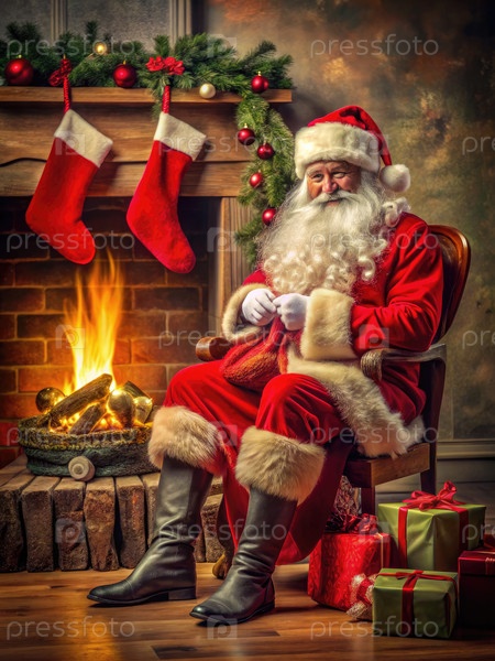 Санта-Клаус сидит у теплого камина с чулками во время праздничного сезона