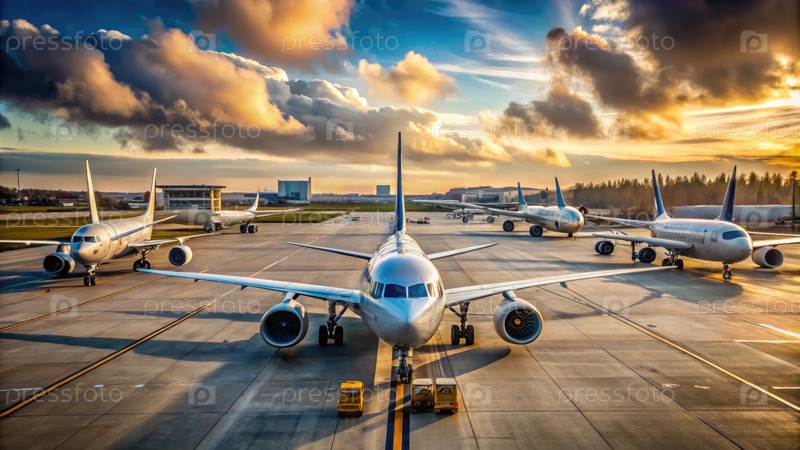 Вид на взлетно-посадочную полосу аэропорта с участием нескольких самолетов при закате солнца с драматическими облаками