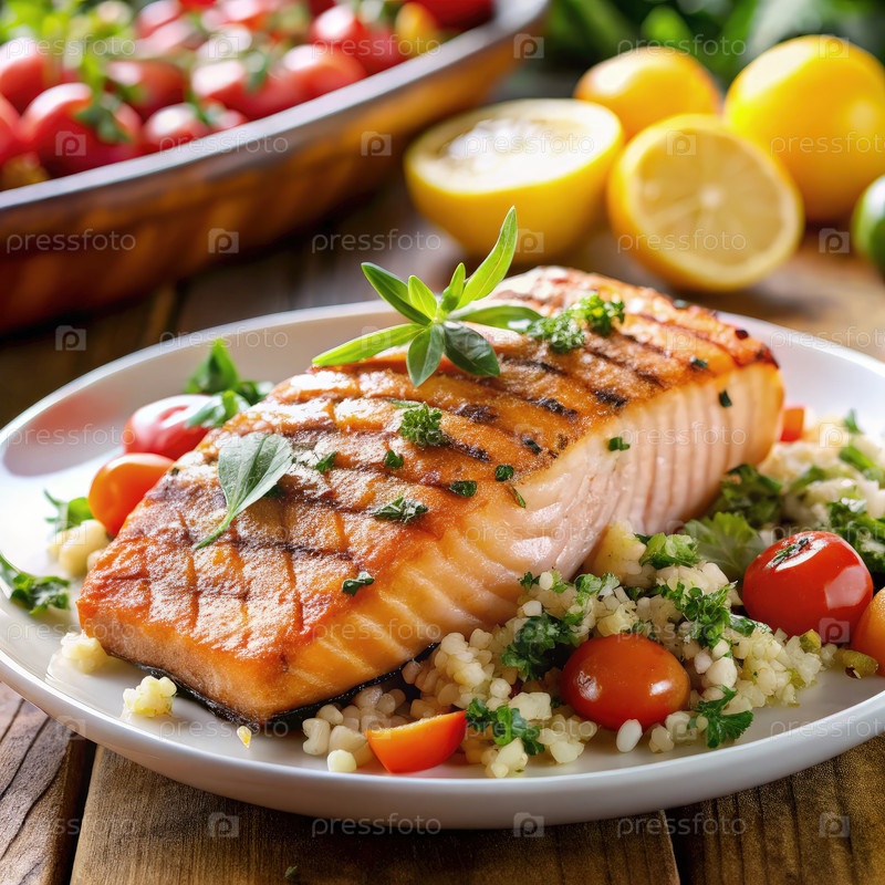 Средиземноморский лосось на гриле подается с томатами-вишенками и лимоном на деревянном столе