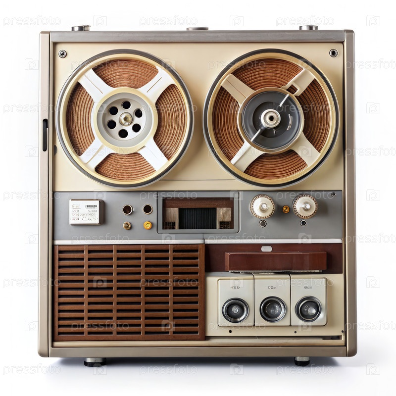Винтажный магнитофон с барабанами, отображаемыми на белом фоне