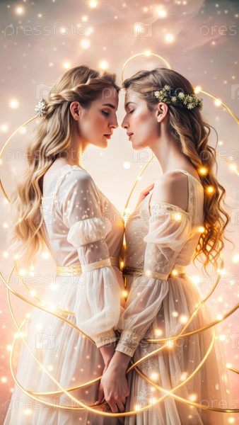 Причудливая иллюстрация Близнецов, символизируемая фигурами-близняшками в элегантном наряде