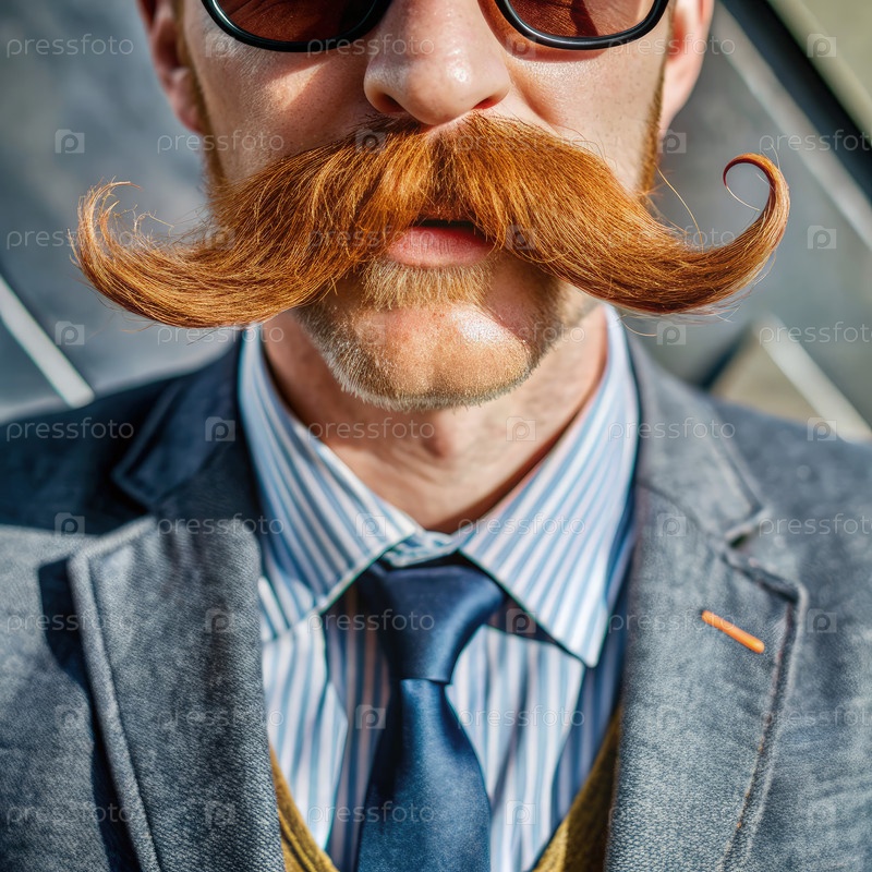 Мужчина с заметными усами, носящий солнцезащитные очки и костюм на открытом воздухе