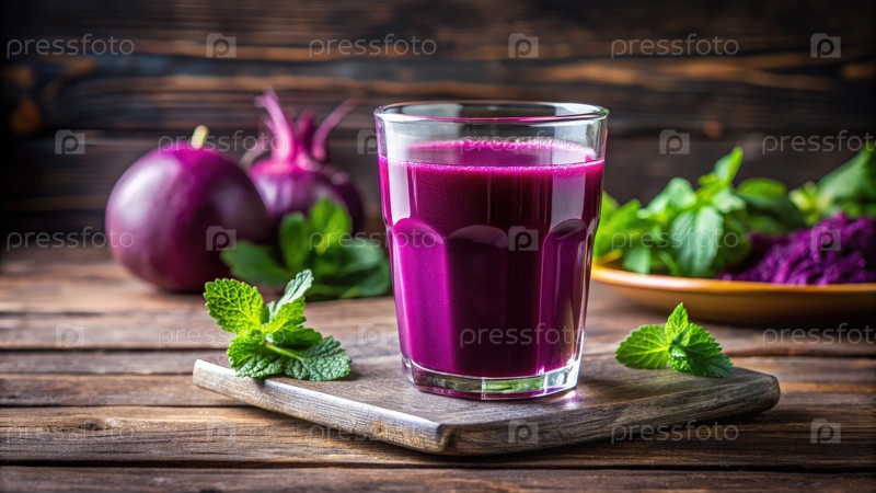Свежеприготовленный фиолетовый сок подается в стакане с листьями мяты и овощами
