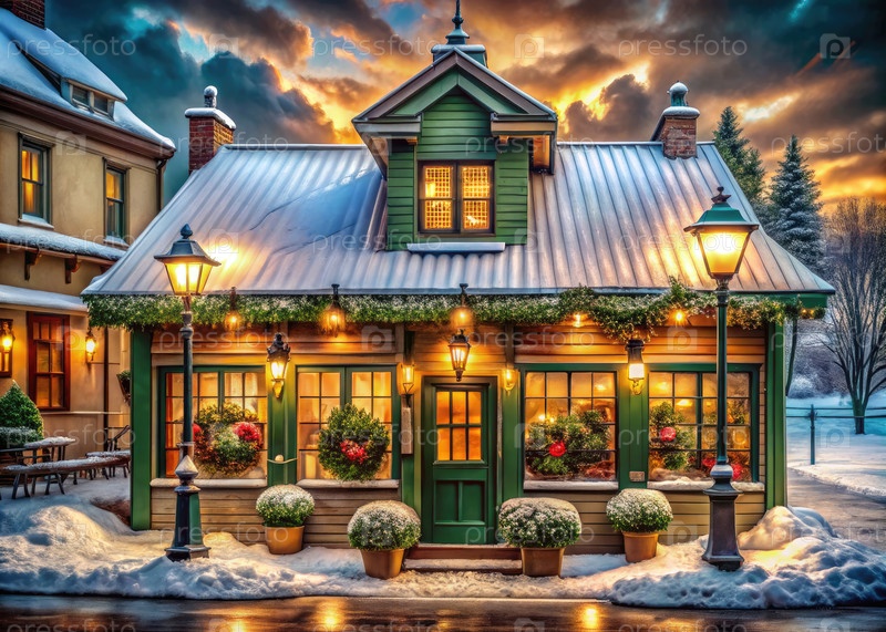 Очаровательное старомодное кафе в снежном пейзаже на закате