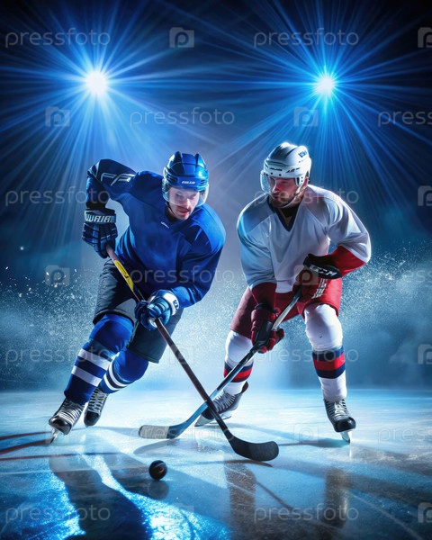 Хоккейные игроки сражаются за шайбу в условиях интенсивной арены
