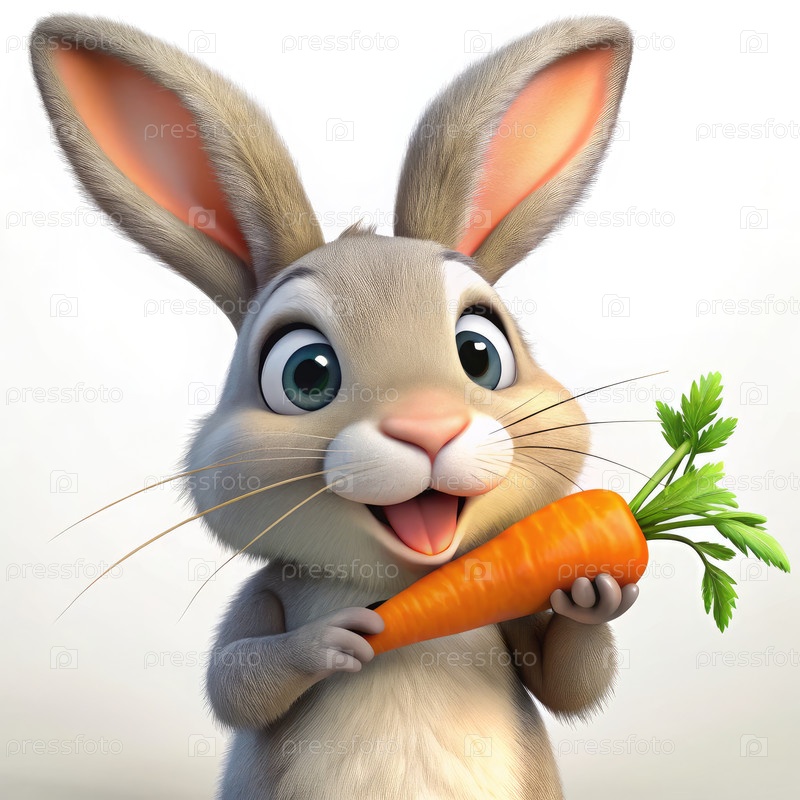 Милый кролик счастливо жует свежую морковь в игривой анимационной сцене