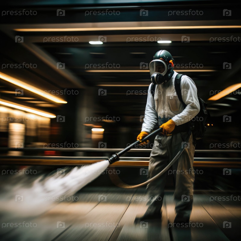 Работник изолирует торговый центр пеной, нося респиратор в оживленной среде
