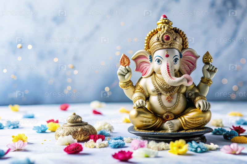 Празднование Ганеша Чатурти с украшенным Господом Ганешей среди красочного декора