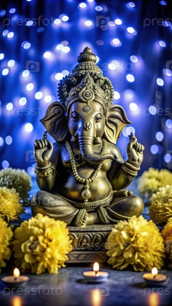 Спокойная атмосфера со статуей Ганеши, окруженной желтыми цветами и мягкими огнями