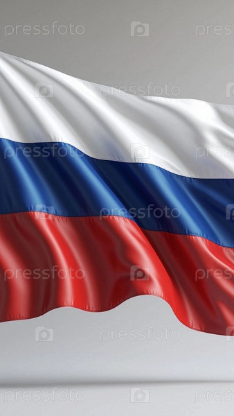 Флаг Российской Федерации на флагштоке, развевающийся на ветру на светлом однотонном фоне