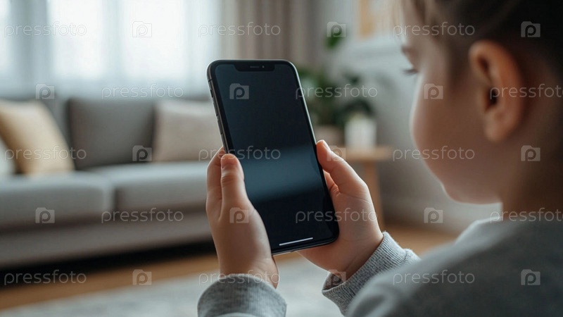Маленький ребенок держит телефон в руках, смотрит на экран. Ребенок с телефоном крупный план