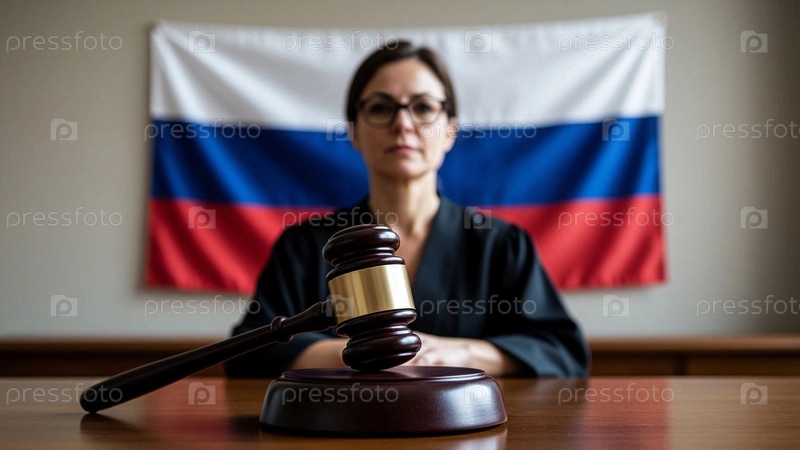 Судейский молоток крупный план. Судья женщина одета в судебную мантию на заднем плане. Российский суд, судья с молотком правосудия