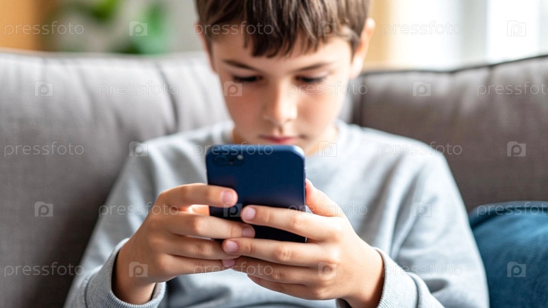 Мальчик школьного возраста держит телефон в руках, смотрит на экран