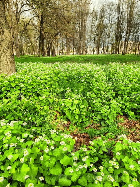 Яркий зеленый ковер с диким чесноком в раннем весеннем лесу, фон наземного покрытия древесины, обои природы