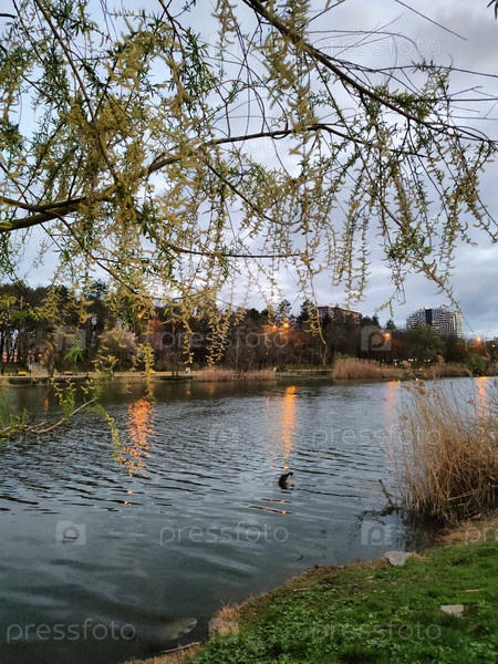 Городское озеро на закате с новой весенней лиственницей, отражениями города и облачным небом, спокойной природой