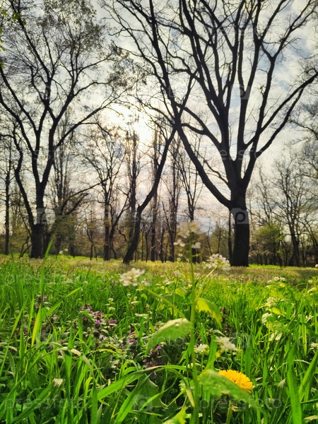 Солнечный парк ранней весны с пышной зеленой травой и голыми деревьями, спокойный фон природы, обои леса