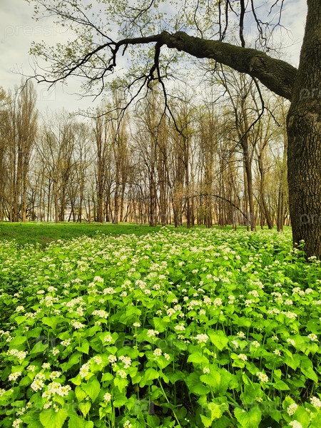 Вибрирующий зеленый ковер с диким чесноком в раннем весеннем лесу, фон наземного покрытия древесины, обои природы