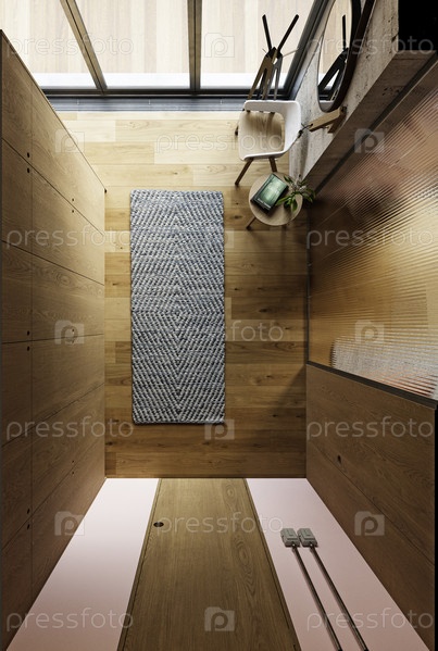 Вид сверху современного деревянного коридора с гардеробом и ковром. 3D-рендер интерьера входа к квартире с мебелью и солнечным светом