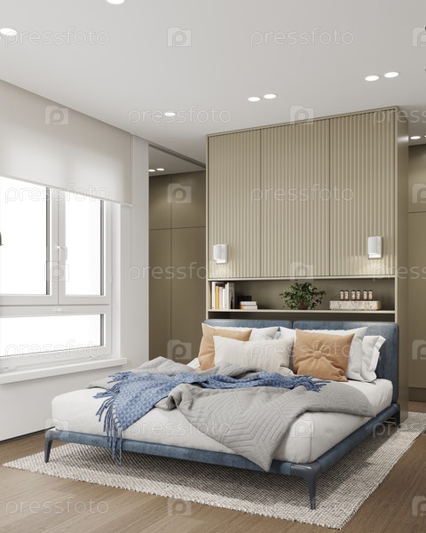 Современный интерьер спальни с голубой кроватью и бежевым гардеробом. 3D rendering уютной спальной зоны с окном. минималистский дизайн дома