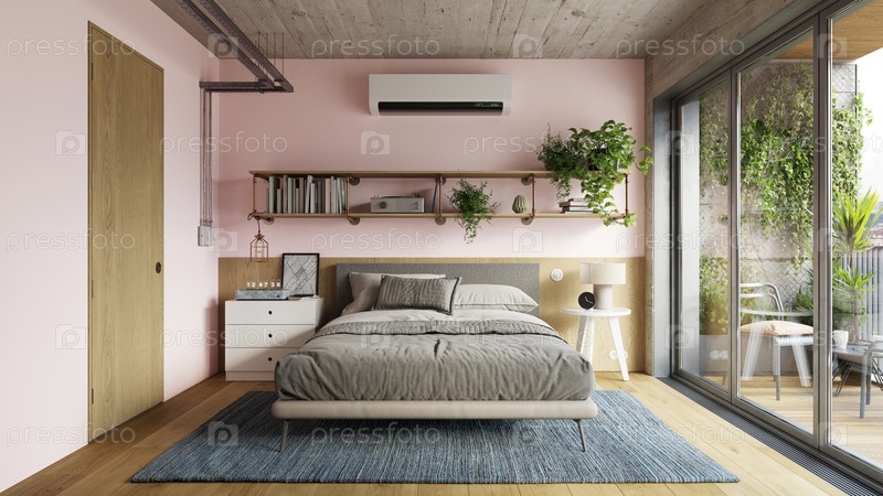 Передний вид 3D-версии стильной современной спальни с розовой акцентной стеной и открытым бетонным потолком. серая кровать расположена в центре на голубом ковре, окруженная белым ночным столом и боковым столиком со лампой. Над кроватью деревянная полка хр