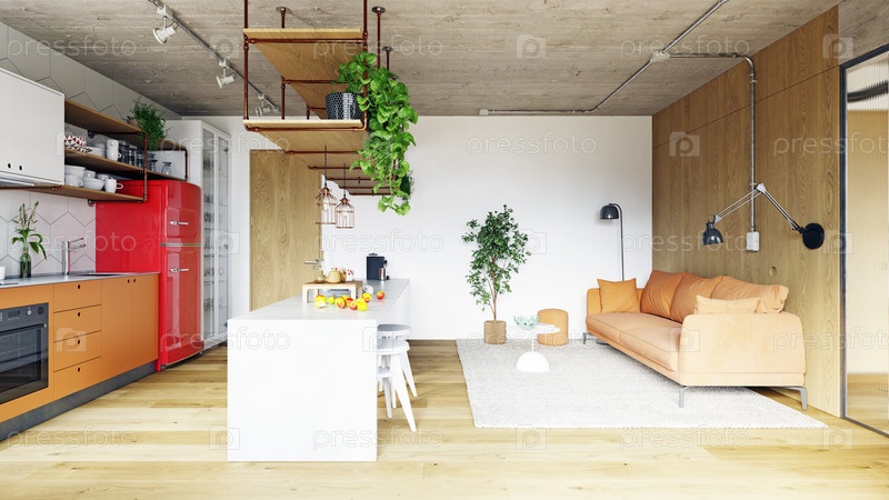 Современный интерьер открытой квартиры с кухней и гостиной. лофт в индустриальном стиле с красным холодильником и бетонным потолком. 3D-рендер