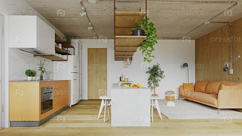 Современный интерьер открытой квартиры с оранжевыми кухонными шкафами и диваном в гостиной. лофт промышленного стиля с бетонным потолком и медными деталями. 3D-рендеринг домашнего дизайна