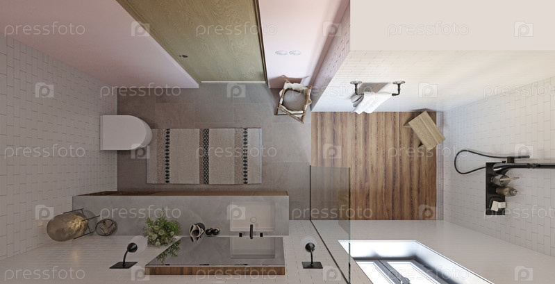 Вид сверху современного интерьера ванной комнаты со душевой и ванитом. 3D-рендер плана дизайна дома с белыми плитками и деревянными деталями