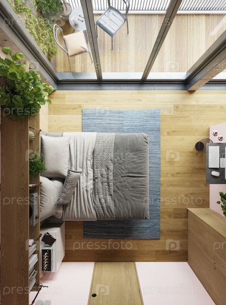 Над головой, сверху вниз 3D-рендеринг современной планировки спальни, подключенной к небольшому балкону. Спальня имеет двуспальную кровать с серыми и бежевыми постельными принадлежностями на голубом ковре, окруженную деревянными полками с растениями и раб